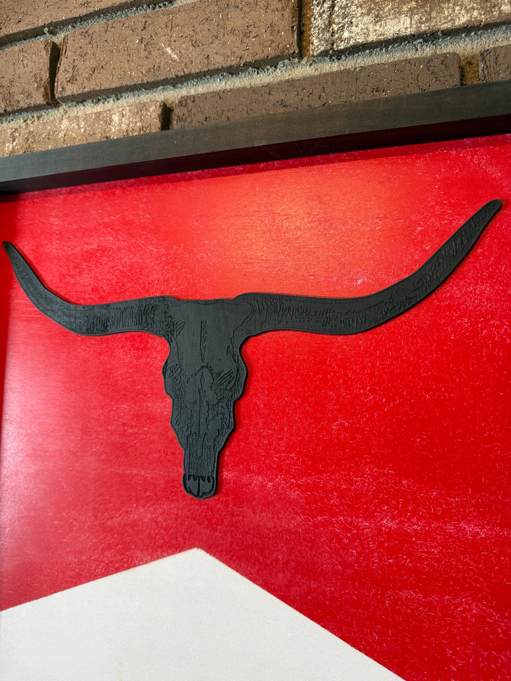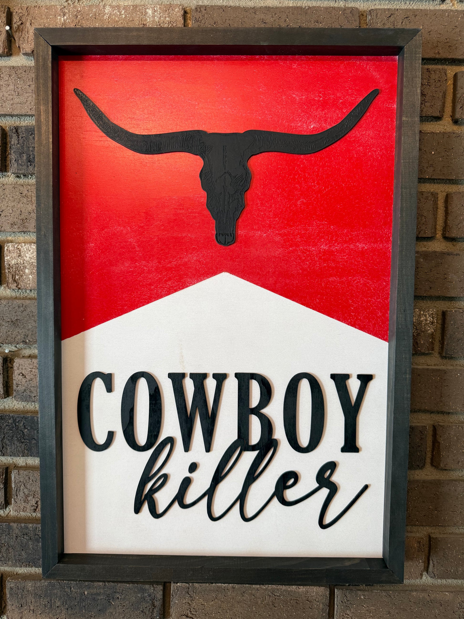 A great western sign playing off of the Marlboro Reds box design with the wording “Cowboy killer” and an etched Longhorn bull skull.