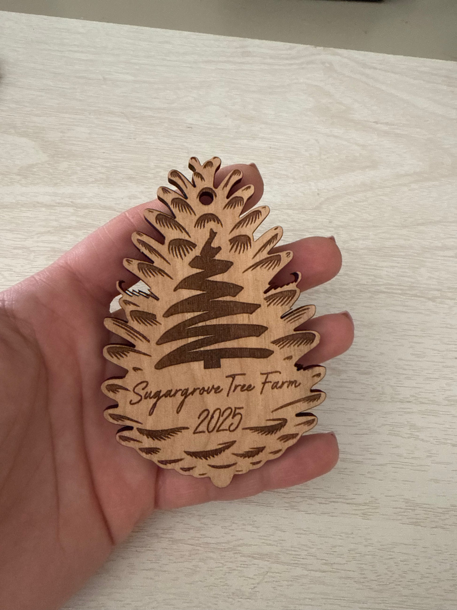 Annual Sugargrove Tree Farm ornament. 2025 is an etched pinecone. 1/4” birch wood with a variety of ribbon.